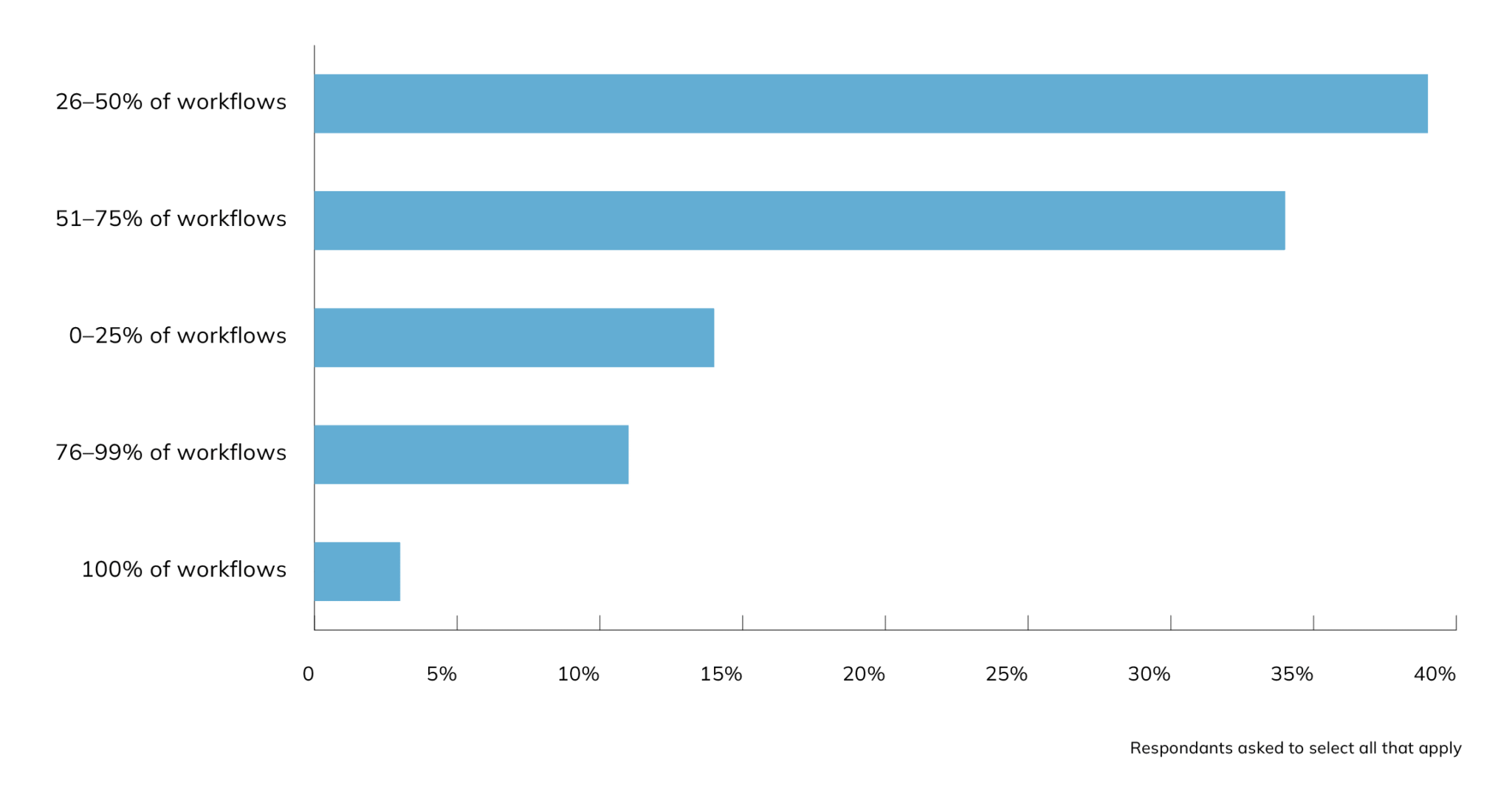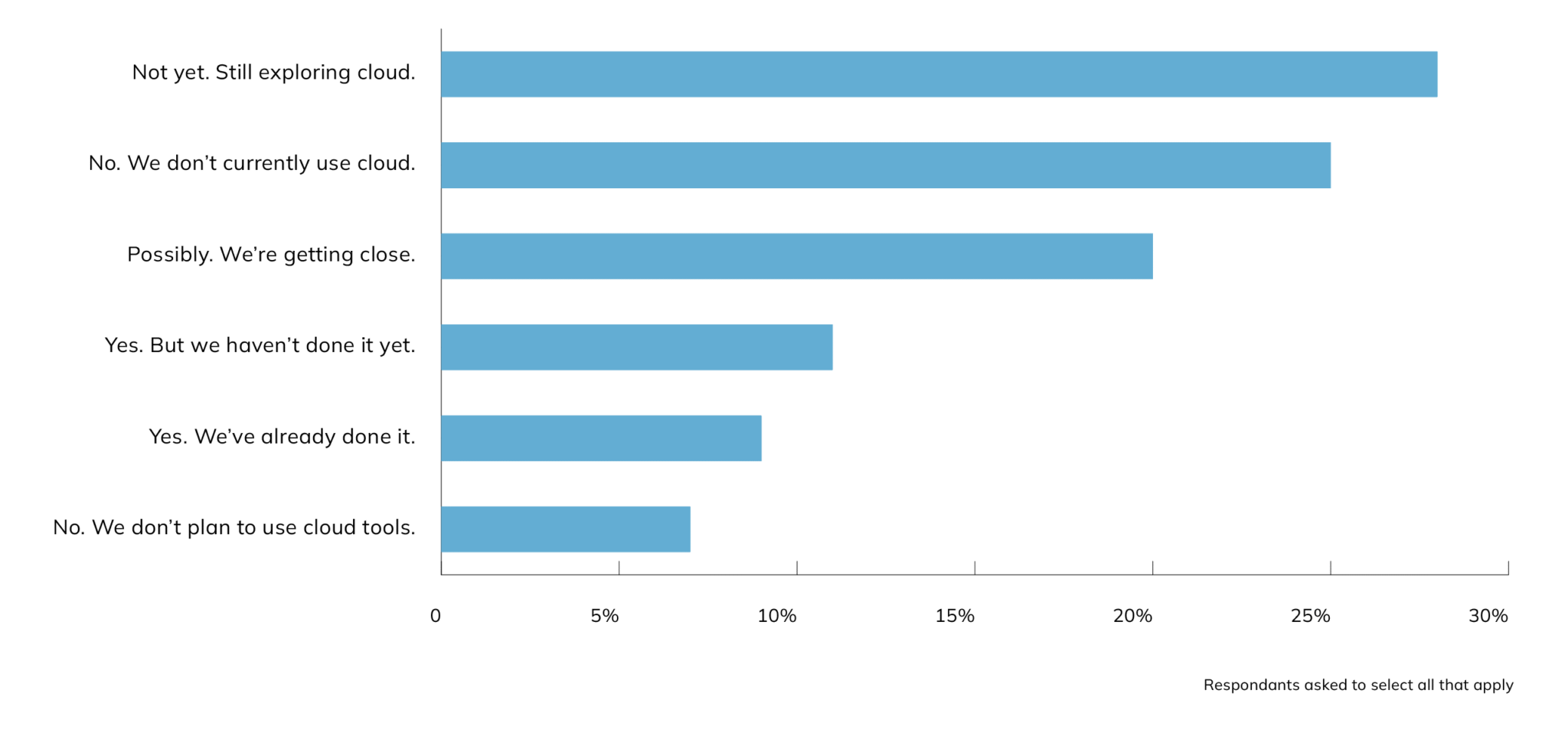 On the second question, few responses sat at either extreme of “almost nothing in the cloud” or “everything in the cloud.” Most forecasts clustered around a substantial but not total shift to cloud-based workflows.
