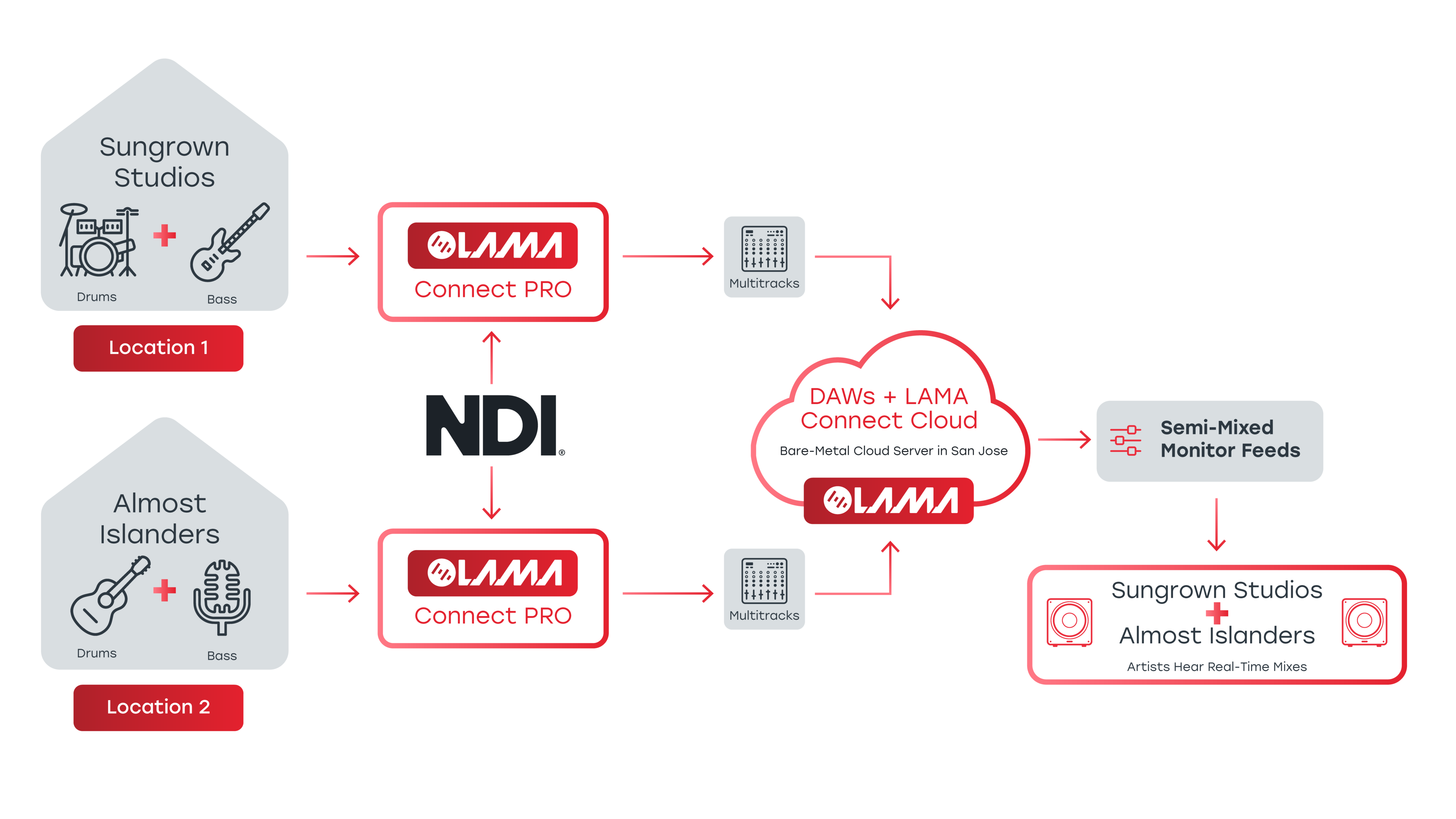 Using LAMA Connect, Almost Islanders and Sungrown Studios combined their two recording environments into a single, powerful system. The two studios ran LAMA Connect Pro and used NDI Bridge to stream audio between them over the internet, with 24 to 30 milliseconds of latency between locations. This setup worked well for the players and preserved the feel of a live session. The system relied on LAMA NDI Sender and Receiver nodes, which support up to 256 audio tracks per stream, or 255 when using NDI Bridge.