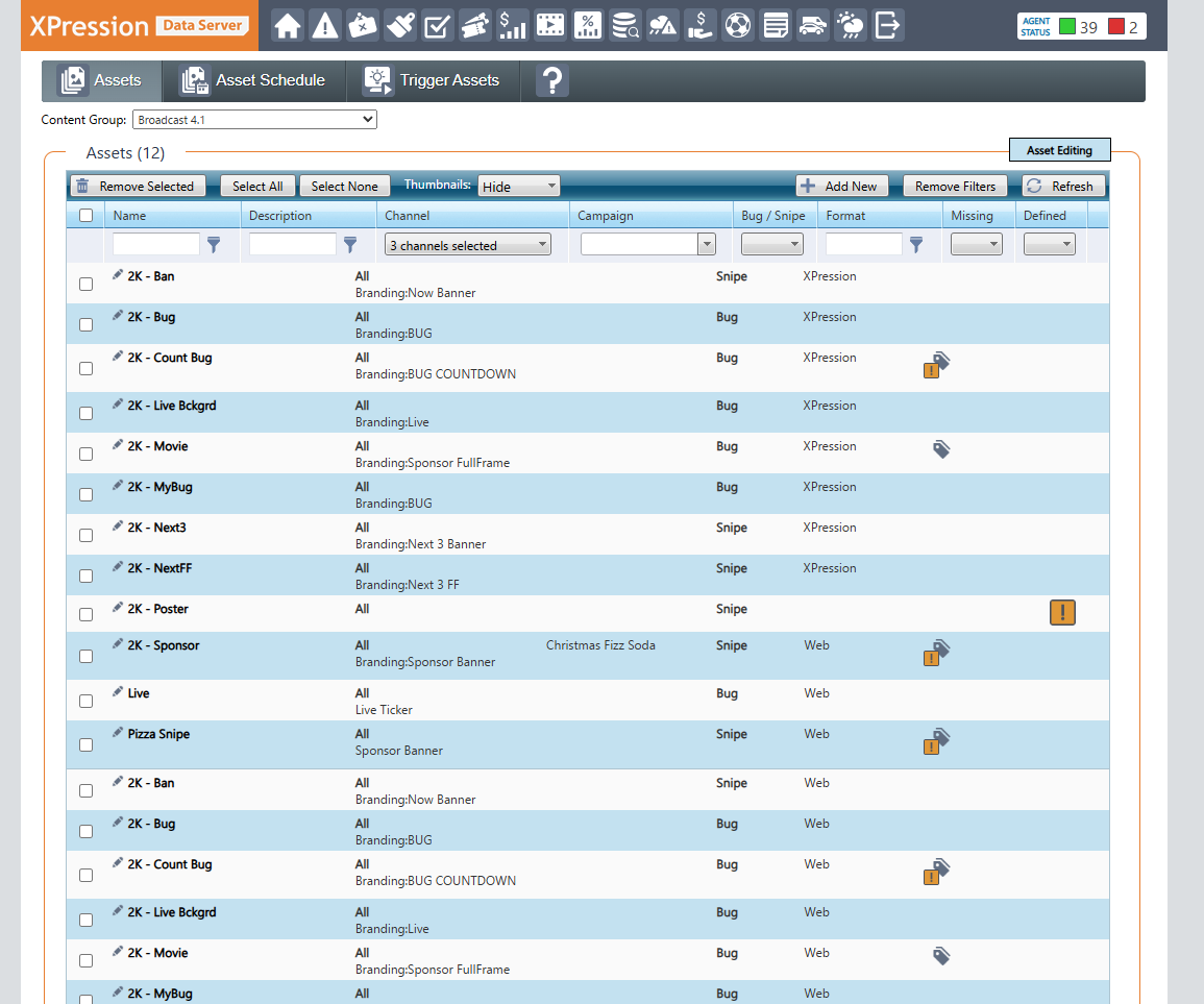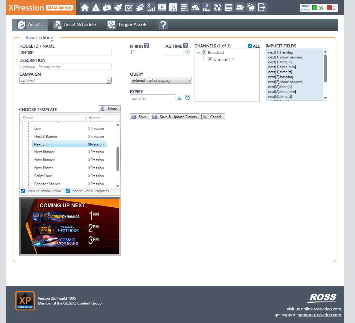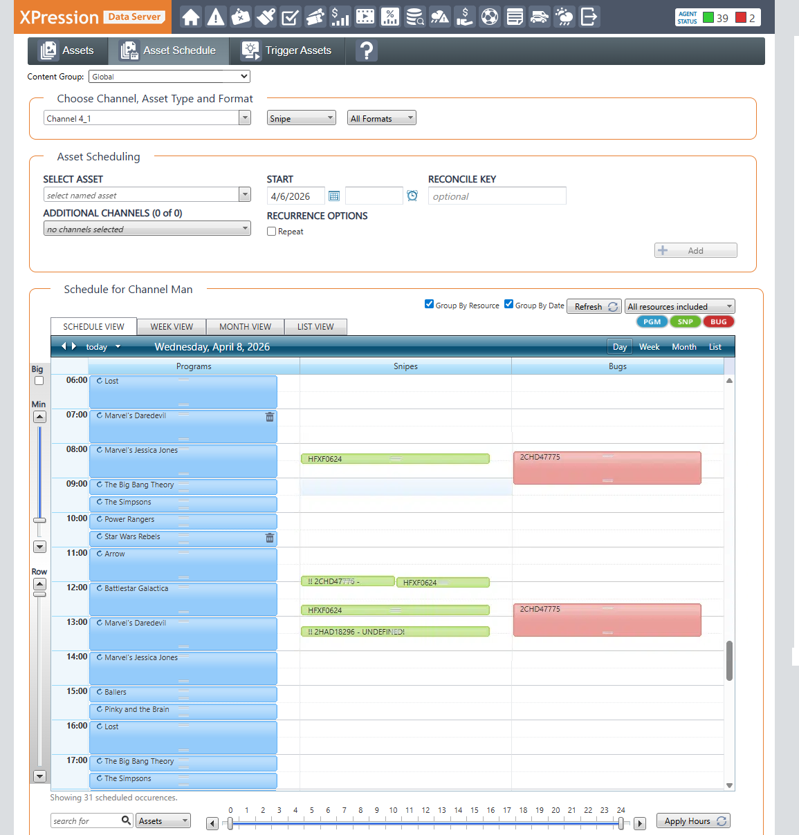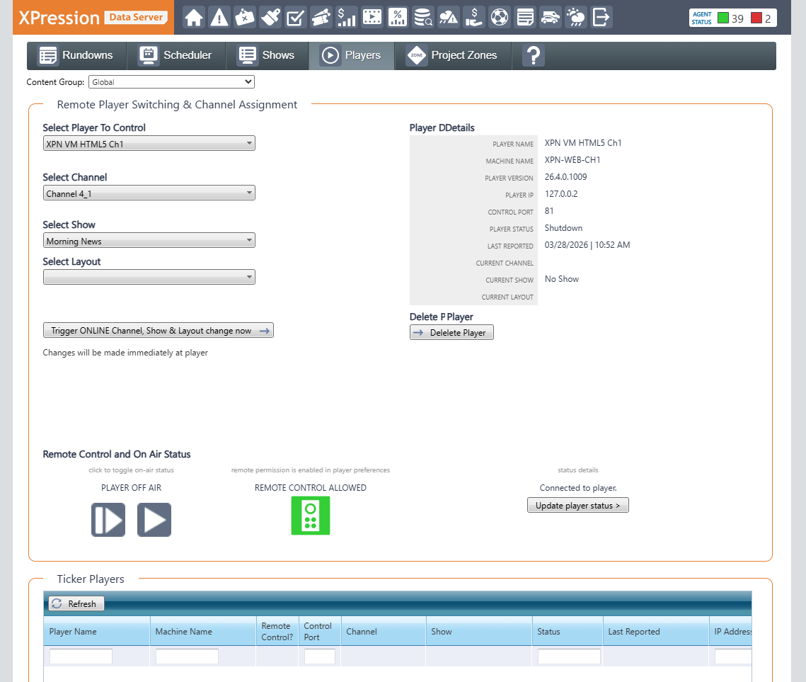 In the event of any unplanned event, it’s always good to be able to take operator control of an automated environment. To manage these situations, the XPression Data Server Player Monitoring & Control application allows master control operators to take graphics on/off air, run crawls, etc. across multiple streams.