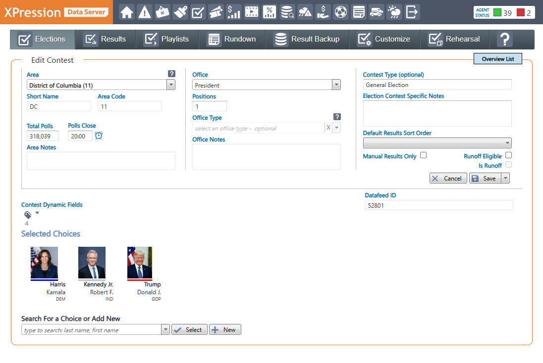 XPression Data Server has an Elections module which allows the newsroom and graphics team to work together to build up candidate databases, with headshots and detailed information. All the races can be set up ahead of time, and integrated with your own data feeds from the Associated Press Election Wires and Decision Desk HQ. For races which are hyper local and not covered by wire services, users can manually input data for the most local race results.