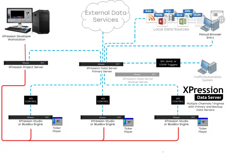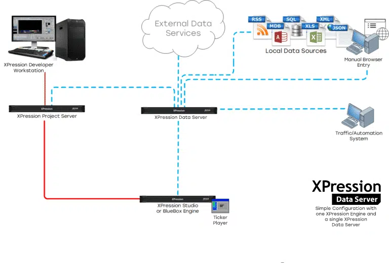 XPression Data Server scales for your needs. A simple XPression Data Server Core server connected to station automation and an XPression engine is enough to drive tickers and branding for most stations.