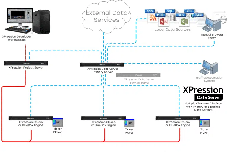 It is possible to add a Backup XPression Data Server Core server to provide redundancy to ease the mind of customers with a mission critical installation, and drive multiple engines to use as a backup or to add tickers and branding to multiple channels coming from one facility.